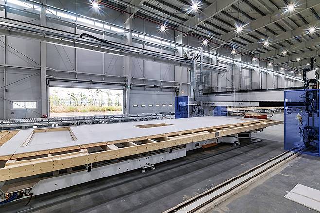 자재 투입과 절단, 두 가지 설비가 합을 이뤄 작업한다. 설계에 맞춰 자재의 길이나 폭을 맞추고, 자재가 쓰이는 부분에 따라서 대각선으로 자르거나 전선이나 배관이 지나가기 위한 홈인 ‘따냄’ 작업도 이뤄진다. 오차 범위가 ±0.05㎜ 이하인 정밀 작업이다. 절단 작업이 이뤄지는 만큼 안전 장치에도 만전을 기했다.