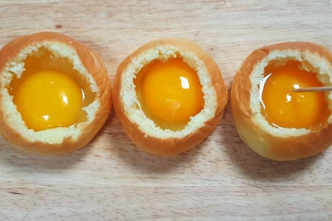 모닝빵 속에 계란을 각각 한 개씩 깨트려 줍니다. 노른자가 터질 수 있으니 이쑤시개로 노른자를 살짝 터트려 주시고 계란 위에 소금 작게 한 꼬집씩 넣어줍니다. 계란은 최대 소란을 사용해 주세요.