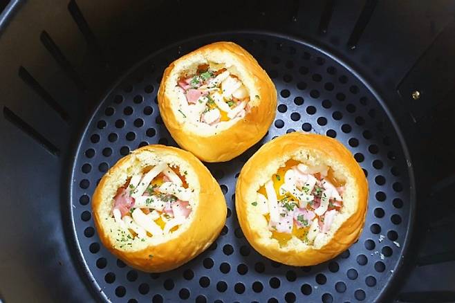 에어프라이어에 넣고 온도 160도에 7-10분 돌려줍니다. 저희 집은 화력이 세서 7분만 돌렸습니다. 에어프라이어마다 화력이 약간씩 다르니 상태 보시고 시간 추가하세요. 에어프라이어 높은 온도로 돌리면 계란은 익지 않고 모닝빵 겉면만 탈 수 있으니 160도 맞춰 구워주셔요.