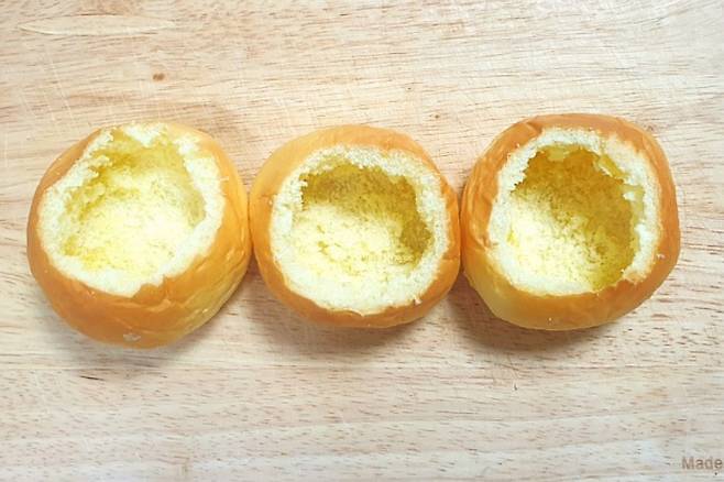 모닝빵 윗면을 칼로 살짝 잘라 속을 파내주세요. 모닝빵이 부드러워서 찢어지지 않게 조심히 살살 뜯어주세요.