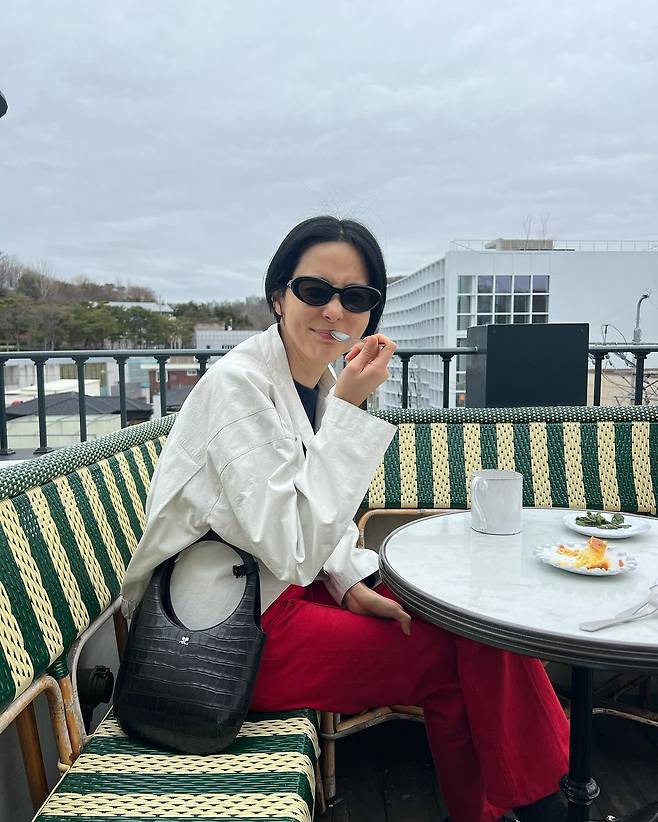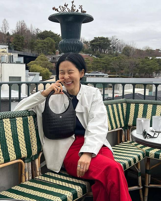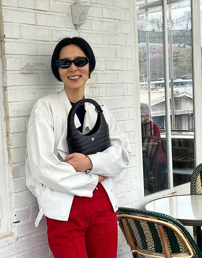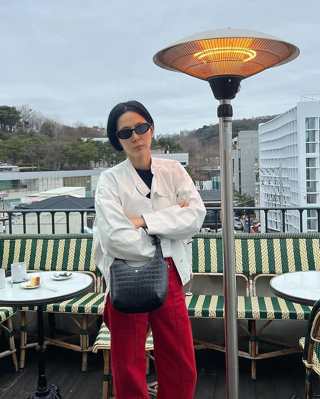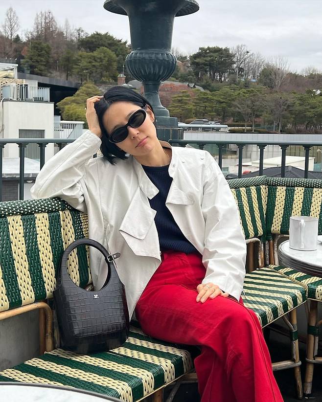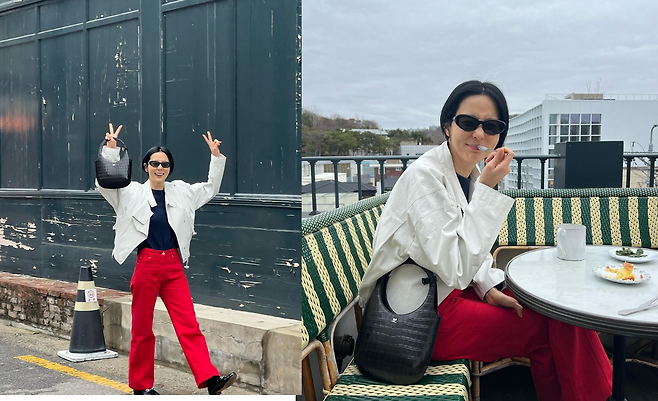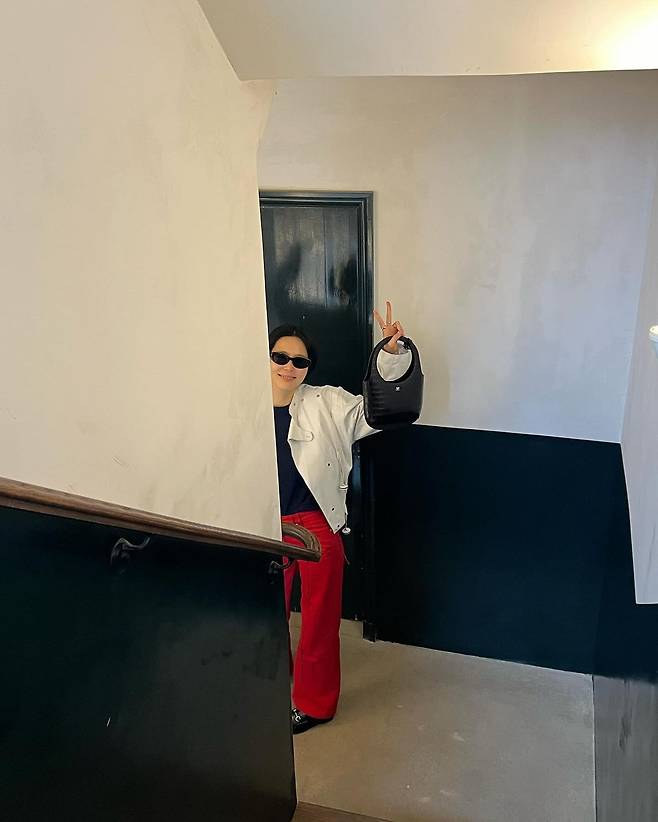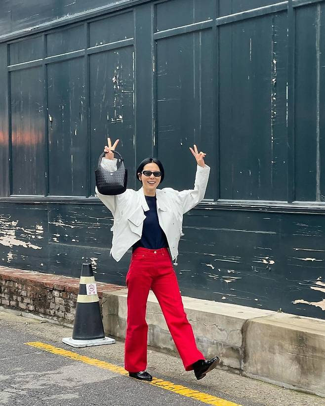 사진 속 김나영은 블랙티를 이너로 입고 아이보리톤의 자켓을 걸치고 빨간 바지를 입었다. 블랙 백과 선글라스를 매치하여 남다른 패션 감각을 선보였다.