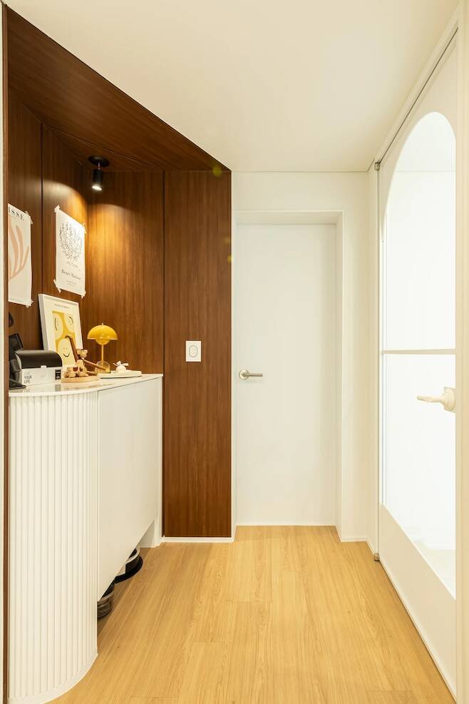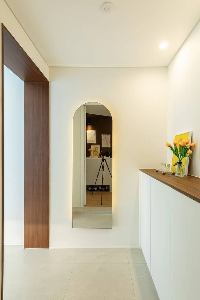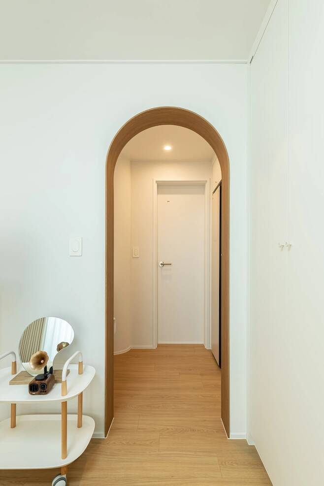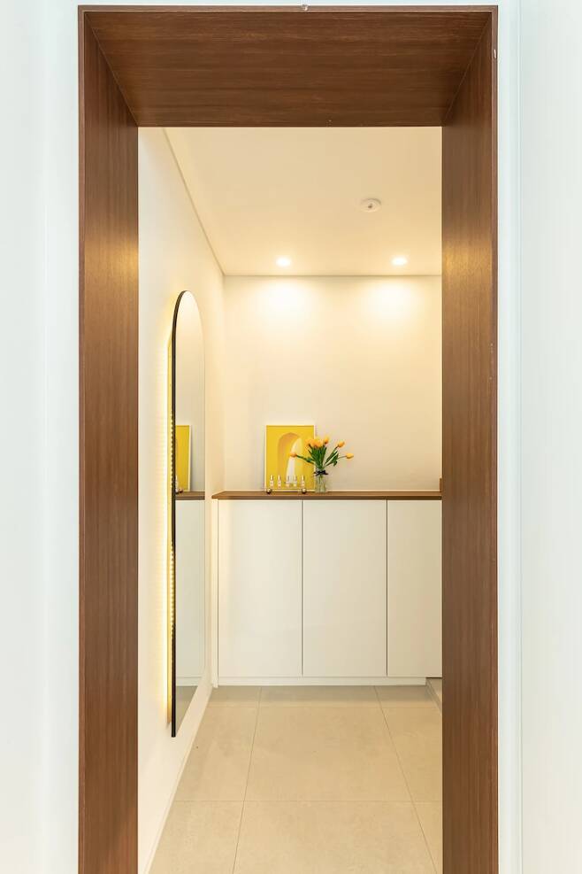 외출 전 마지막으로 매무새 정리하고 전체적인 코디를 체크하기 아주 좋은 공간이에요. 중문의 아치와 전신거울의 아치가 대칭이 되도록 배치해서 문을 닫고 거울을 봐도 잘 보이고 조화로워요.