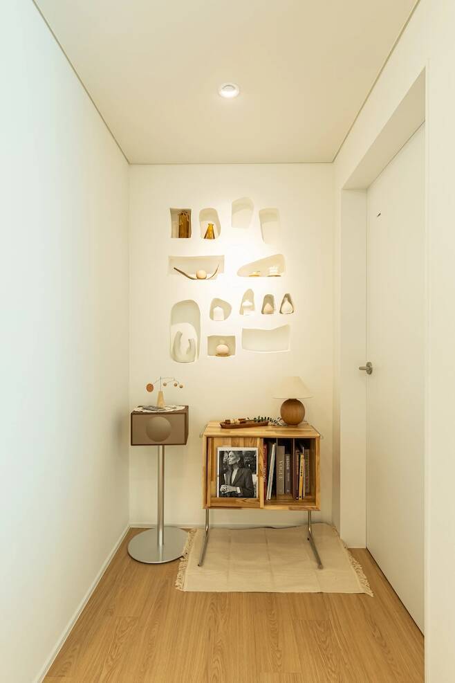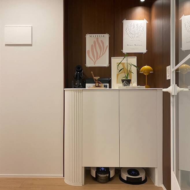 그리고 더 부각되도록 조명도 넣어 주었어요. 똑같은 화이트 우드라도 저희 집만의 포인트를 갖고 싶었거든요! 지인들이 저 공간을 보고 예쁘다고 많이 칭찬해 준답니다.