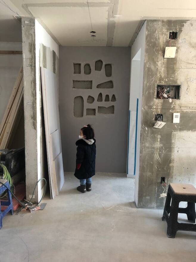 예전에 어떤 카페 사진에서 저렇게 벽에 구멍(?)을 여러모양으로 파내어서 오브제를 전시해 둔 공간이 떠오르더라고요. 반장님들도 처음 해보는 작업이라고 걱정하셨지만, 생각처럼 예쁘게 나와주었답니다.