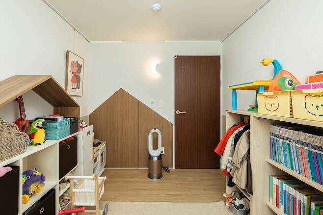 너무 좋아해 줘서 제가 더 기쁘답니다. 이곳에도 역시 우드로 포인트를 주고 싶어서 포인트로 산 모양의 우드를 만들어 줬어요. 그리고 그와 어울리는 뾰족한 우드 지붕 모양이 있는 교구장을 배치했어요. 벽지는 투톤으로 우드 화이트의 무드를 표현해 보았어요. 제 생각이지만 투톤 벽지는 더 포근한 느낌을 만들어 주는 것 같아요.
