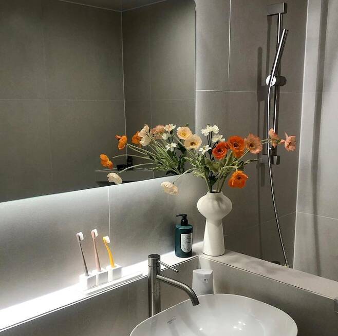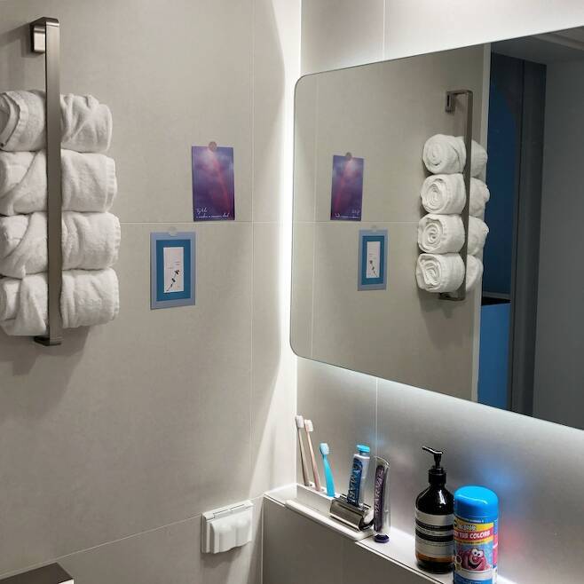 다만 반신욕을 하거나, 아이가 욕조에서 목욕하고 나오면 결국 바닥 러그가 많이 젖지만, 자주자주 세탁하고 휴젠뜨를 환기 기능을 이용하여 뽀송하게 유지하고 있답니다. 콘셉트는 호텔 화장실 이었는데, 끝까지 유지될 수 있도록 열심히 노력 중이랍니다.ㅎㅎ
