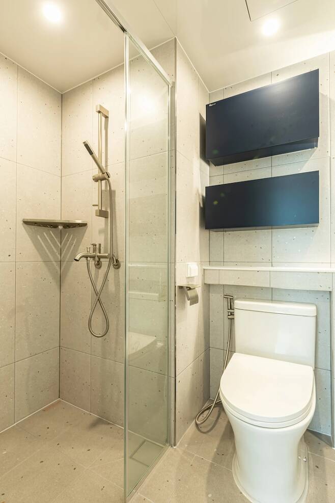 이 욕실엔 수납장을 달아 수건, 여분의 샴푸 등을 보관해 놓았어요. 또, 이곳에서도 휴젠뜨가 열일 하고 있어요. 뽀송하게 지낼 수 있도록 도와주는 일등 공신이에요.