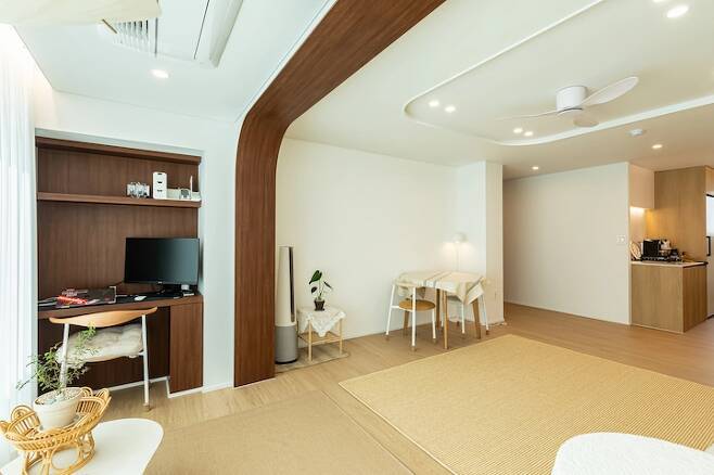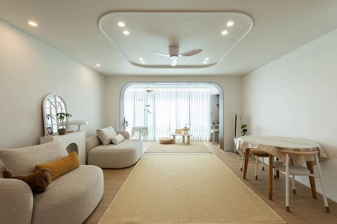 아치 포인트가 예쁜 저희 집 거실이에요. 내력벽이 있어서 확장을 했음에도 확 트인 개방감은 부족했지만, 밖의 뷰가 너무나도 그림 같았기에 액자 프레임 같은 느낌을 주려 진한 우드 컬러를 입혀 아치를 만들었어요. 프레임 같은 효과가 좀 있나요?