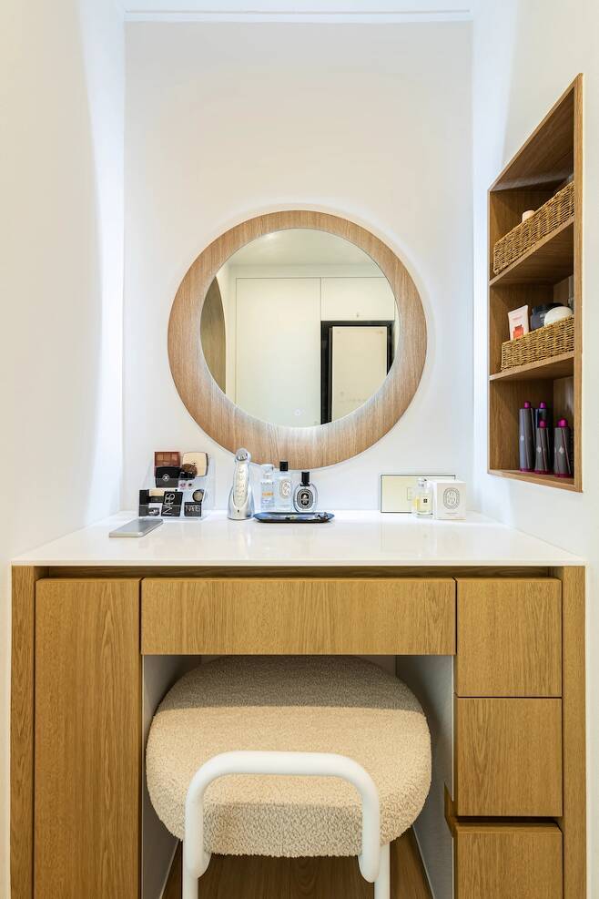 화장대에선 제가 제일 예뻐 보여야 하니😅 터치식으로 주광색과 주백색으로 변경이 가능한 거울을 설치했어요. 새벽에 남편보다 먼저 출근해야 할 때 저 불만 켜고 화장하는데 안방에 간섭을 주지 않고, 독립된 공간에서 저만 조명을 받을 수 있기 때문에 잘 선택한 것 같아요.