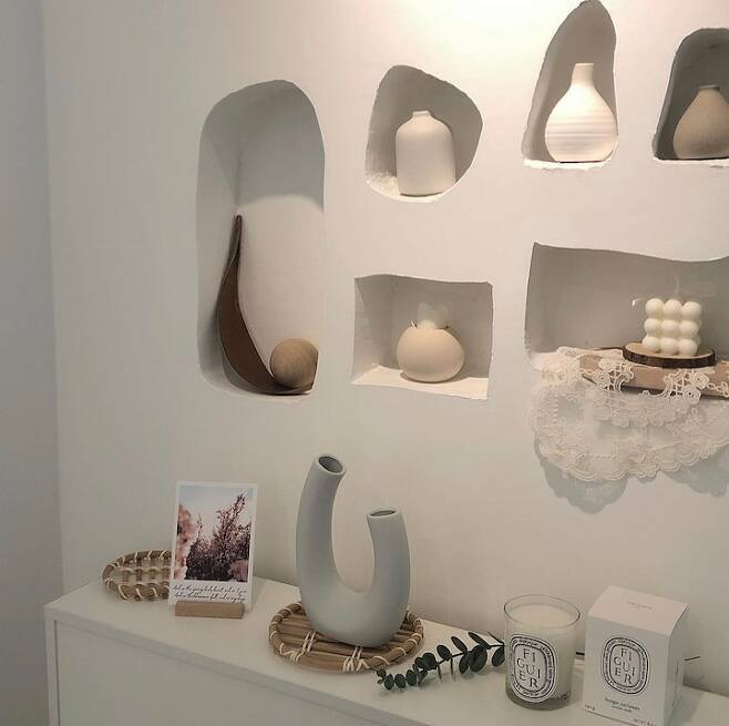 원래는 아무것도 없이 벽만 있던 공간에 제가 그림을 그리고, 작업반장님께서 전동 톱으로 그림을 따라 파내고, 도장으로 마무리해서 완성되었어요. 자세히 보면 내부엔 페인트의 질감이 느껴져요. 오돌토돌하고 거친 느낌이 있지만, 그마저도 오브제와 잘 어울리는 느낌이에요. 아기자기한 소품을 좋아하고, 오브제를 감상하는 것을 좋아해서 딱 저의 취향을 저격하는 공간이에요.