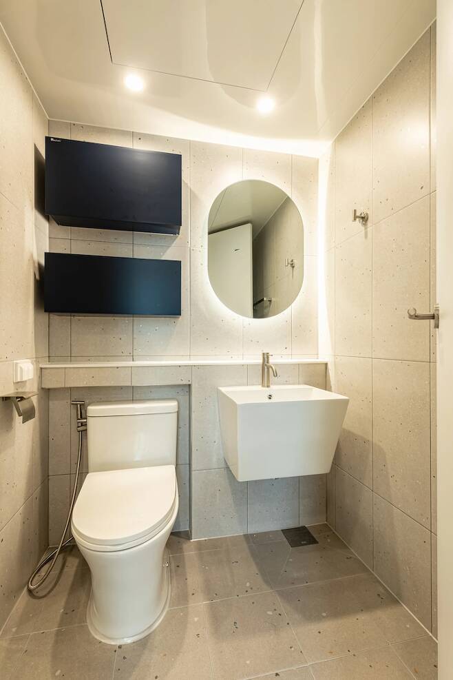 공사를 마친 안방 욕실이에요. 저희 욕실은 덧방을 하고 부분적으로 방수를 더 했답니다. 여태까지 살면서 문제가 없었던 집이라면 굳이 모두 철거하고 할 필요 없다고, 자신 있다는 인테리어 업체 차장님 말을 믿고 진행했어요.