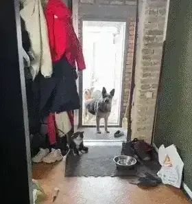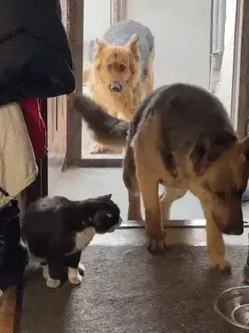 원래 고양이를 키우지 않았던 집에 세 마리의 커다란 셰퍼드가 길고양이를 데려왔습니다. 주인의 허락을 받을까 불안해하며 문 앞에 서 있는 강아지들의 모습은 정말 애처롭고 사랑스러웠습니다.