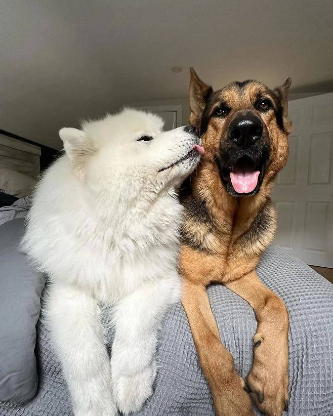두 강아지의 마지막 투샷은 더욱 귀여웠습니다. 셰퍼드의 매력에 반짝이는 눈빛으로 바라보는 사모예드의 모습은 정말 사랑스러웠습니다.