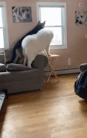또 다른 감동적인 이야기는 셰퍼드와 사모예드의 우정입니다. 두 마리가 소파 위에서 창밖을 바라보던 중, 사모예드가 불안정한 테이블 가장자리에 발을 올리다가 넘어질 뻔한 상황이 있었습니다.