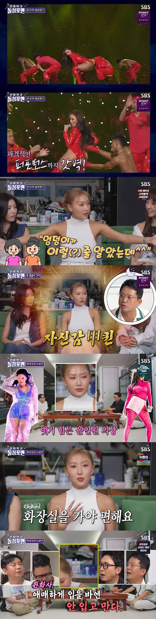 그러나 파격 의상 고충도 있었다. 화사는 화장실을 가면 현타가 온다고. 화사는 "머리부터 발끝까지 다 벗어야 하니까"라며 "목이 건조해지면 안 되니까 물을 수시로 계속 마신다. 그러니까 꼭 무대 올라가기 전에 화장실을 가고싶더라"라고 이야기했다.