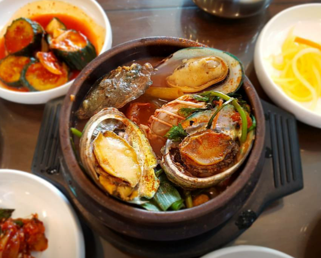 전복해물뚝배기 – 된장 베이스 국물에 전복, 딱새우, 게가 푸짐하게 들어간 해산물 뚝배기