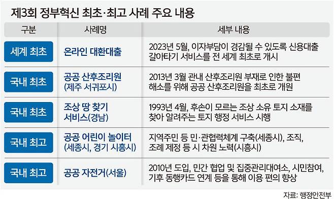금융위의 ‘온라인·원스톱 대환대출(대출 갈아타기 서비스)’가 세계 최초의 정부 혁신 사례로 선정됐다. 정부는 온라인 대환대출로 국민 1인당 연간 162만원의 이자를 절감하는 등의 성과를 거둔 것으로 평가했다. 경남도의 ‘조상 땅 찾기 서비스’ 등은 국내 최초의 혁신 사례로 선정됐다.
