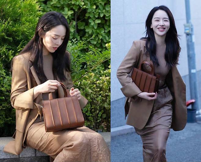 여기에 구조적인 디자인의 브라운 핸드백으로 스타일링에 포인트를 줬으며, 내추럴하게 풀어낸 생머리가 도시적인 분위기를 자아냈습니다.