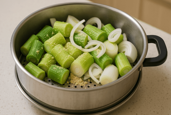 버무린 대파를 찜기에 올릴 때 양파를 함께 살짝 곁들이면 단맛과 감칠맛이 배가된다. 양파는 많이 넣지 않아도 충분한 단맛을 내며, 찜기 안에서 나는 수증기를 타고 파에 자연스럽게 향이 배어든다. 양파의 수분이 대파의 익힘을 더 부드럽게 만들어주는 역할도 한다.