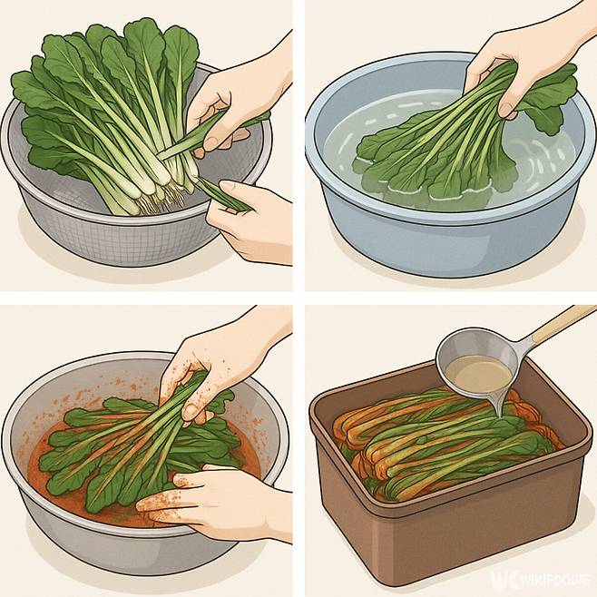 풋내 없는 열무김치는 절이는 시간, 세척, 수분 제거, 숙성까지 모든 과정이 균형을 이루어야 완성된다. 절이는 시간은 정확하게 1시간, 이보다 짧으면 덜 절여지고 길면 질긴 줄기만 남는다. 씻은 후에는 최대한 물기를 턴다. 젖은 채 담으면 김치가 금세 시어진다.