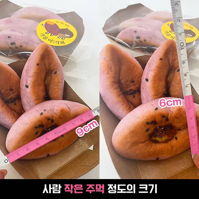 사이즈를 측정해 본 결과 가로 9cm, 세로 6cm 정도 나왔는데요. 손이 작은 사람 주먹 정도..? 두 입 정도면 꿀꺽할 수 있는 크기였어요.