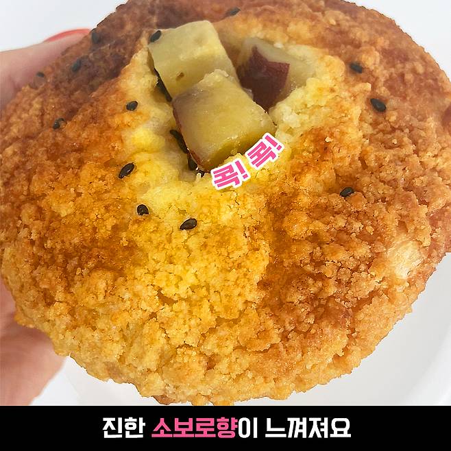 기존의 소보로는 바삭바삭하고 약간은 텁텁한 느낌이었다면 고구마 소보로는 살짝 촉촉하고 부드러운 느낌이에요.