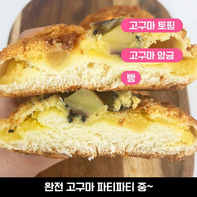 표면에 고구마 토핑이 있어 씹는 맛도 더해지는 느낌이에요. 개인적으로는 이 고구마 토핑이 반죽에도 쏙쏙 들어있었으면 더 맛있을 것 같아요. 살짝 아쉬웠어요. 유유.