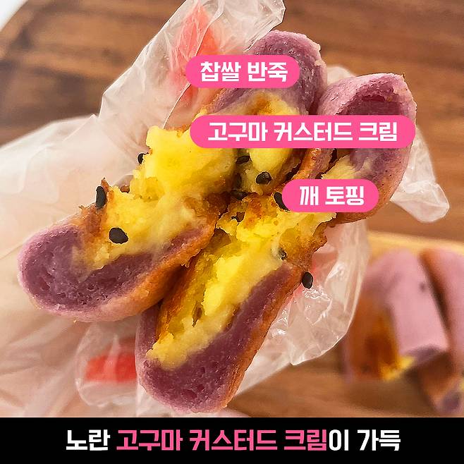 쫀득한 찹쌀 반죽이 겉을 감싸고, 그 안에는 부드럽고 달콤한 커스터드 크림이 가~득. 그리고 빵 위에 고소한 깨 토핑까지! 삼 박자가 아주 잘 맞아 맛있는 쫀득 고구마 호떡이 완성된다구요.