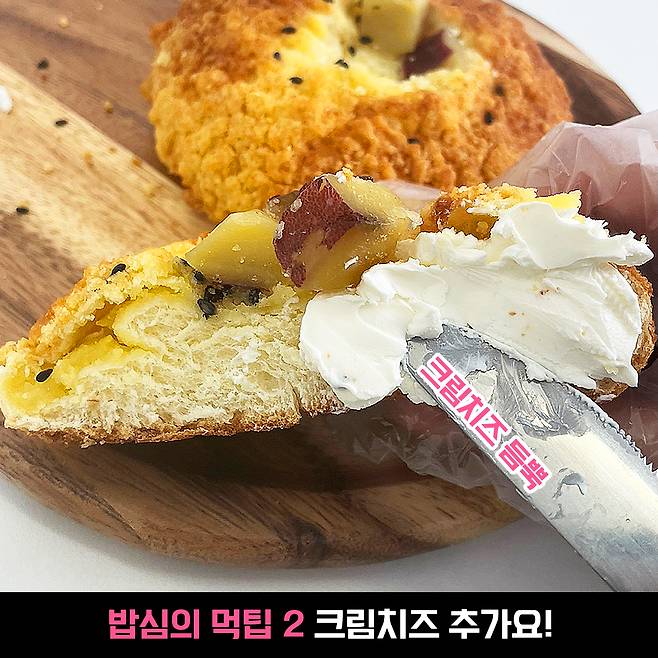 두 번째 방법은 고구마 소보로에 크림치즈 발라먹기. 사실 소보로가 살짝 퍽퍽할까 봐 부드러운 크림치즈를 함께 샀는데, 소보로 자체가 크게 퍽퍽하진 않았어요.