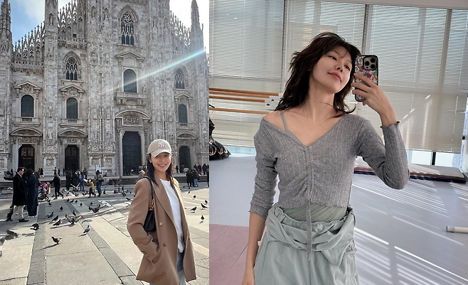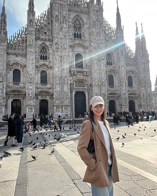 수영은 이탈리아 밀라노 대성당을 배경으로 세련된 캐주얼 룩을 연출하고 있다. 베이지 톤의 더블브레스트 코트를 화이트 티셔츠와 데님 팬츠 위에 레이어링하여 편안하면서도 우아한 분위기를 완성했다. 뉴욕 양키스 로고가 새겨진 베이지 컬러 캡으로 스포티한 포인트를 더해 유럽 여행객다운 자연스러운 매력을 발산하고 있다.
