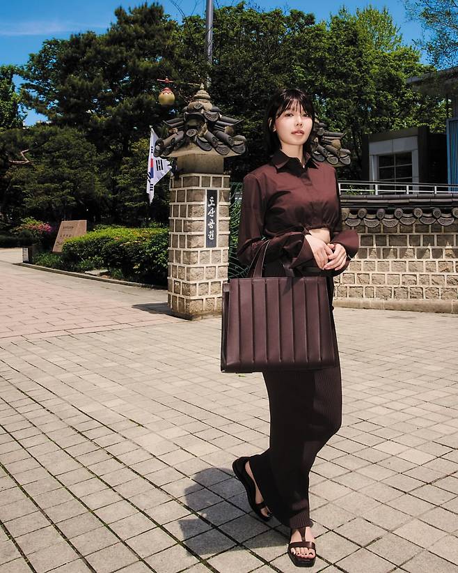 브라운 톤의 한복에서 영감을 받은 듯한 원피스로 동양적 우아함을 연출하고 있다. 깔끔한 칼라 디자인과 절제된 실루엣으로 모던한 감각을 더하며, 플리츠 디테일의 핸드백으로 전체적인 조화를 완성하고 있다.
