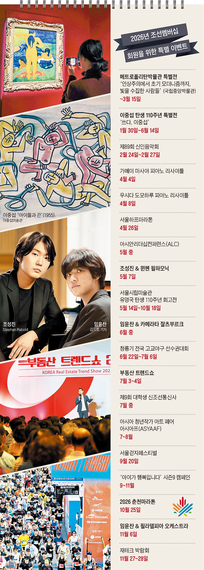 피아니스트 조성진과 임윤찬 연주회는 티켓팅 자체가 큰 ‘고비’입니다. 멤버십 회원들께 추첨을 거쳐 관람권을 제공합니다. 일본 클래식계를 대표하는 가메이 마사야와 우시다 도모하루의 4월 리사이틀에도 회원을 초대합니다. 예술가의 등용문인 조선일보 신인 음악회와 국내 최대 청년 미술 축제 ‘아시아프’를 현장에서 즐길 수 있는 회원 전용 초대권도 마련 중입니다.