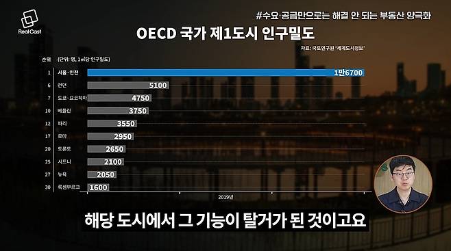 부동산 문제를 단순한 수요 공급의 문제로 접근하면 해결이 어렵습니다. 전국 단위의 도시 기능 변화 속에서 사람들의 이동이 발생하고 있는데, 이러한 구조를 무시한 채 서울에 몇만 채를 더 짓는다고 해결되지 않습니다. 핵심은 기능을 상실한 도시의 회복이며, 그렇지 않으면 서울 중심구만 살아남는다는 인식이 사회 전체에 퍼지게 됩니다.