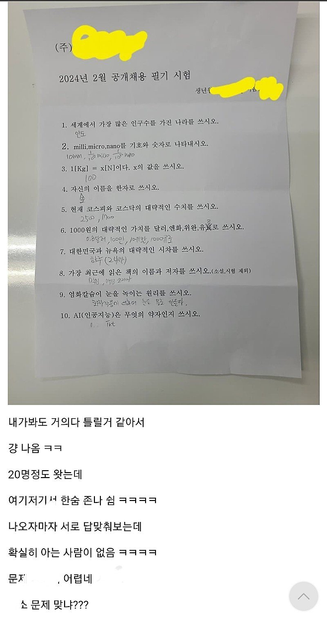 어느 중소기업 공개채용 필기 시험 난이도