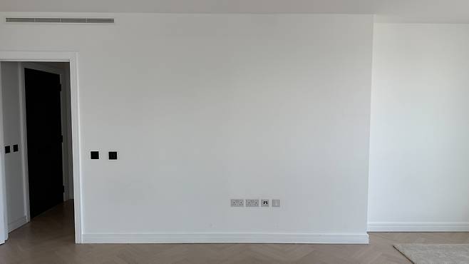 가로 3.2미터 정도의 무광 화이트 벽면이에요