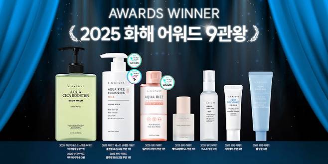 에스네이처는 이번 ‘2025 화해 어워드’에서 △아쿠아 라이스 클렌징 밀크(2025 뷰티 어워드 클렌징 로션/크림 부문 1위, 2025 하반기 베스트 신제품 어워드 클렌징 로션/크림 부문 1위) △아쿠아 라이스 립앤아이 리무버(2025 뷰티 어워드 립/아이 리무버 부문 1위) △퍼펙트 아쿠아 메이크업 베이스 프렙 (2025 뷰티 어워드 메이크업베이스 부문 1위) △아쿠아 시카 부스터 바디워시(2025 뷰티 어워드 바디워시 부문 3위, 2025 하반기 베스트 신제품 어워드 바디워시 부문 1위) △아쿠아 스쿠알란 미스트(2025 뷰티 어워드 미스트 부문 2위) △아쿠아 소이 요거 아이크림(2025 뷰티 어워드 아이케어 부문 2위) △아쿠아 오아시스 수분 젤크림(2025 뷰티 어워드 젤 부문 3위)을 수상하며 우수한 성과를 보였다.