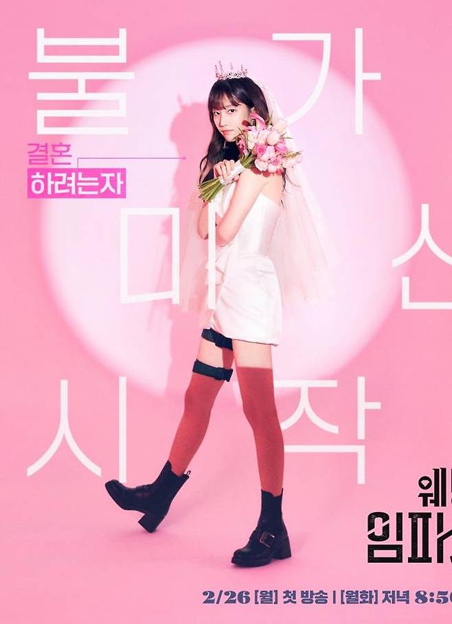 공개된 포스터에서는 ‘결혼하려는 자’ 나아정과 ‘결혼 깨려는 자’ 이지한의 남다른 각오를 엿볼 수 있다. 나아정은 웨딩드레스와 티아라, 면사포를 쓴 채 결혼이라는 미션을 수행하기 위한 만반의 준비를 갖췄다. 러블리한 매력이 물씬 느껴지는 드레스 아래로 드러난 건벨트와 가죽 부츠는 일반적인 신부와는 사뭇 다른 특별한 분위기를 자아낸다.
