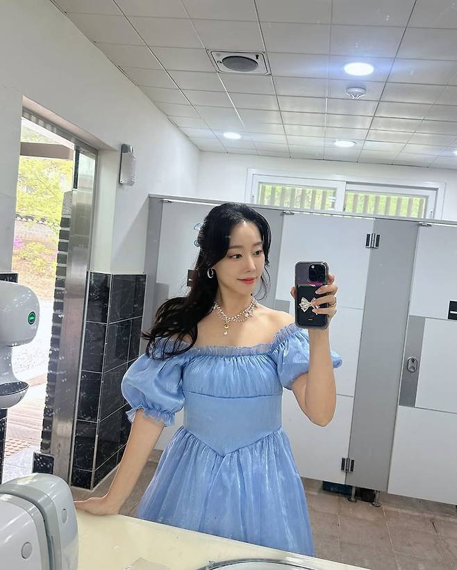 특히 드레스는 살짝 비치는 쉬폰 텍스처가 매력 포인트였다. 풍성한 퍼프소매와 셔링 디테일이 어우러져 전체적으로 우아한 실루엣을 완성했으며, 목선을 따라 흐르는 진주 목걸이 레이어링으로 고급스러움을 더했다. 고우리는 베일 듯한 부드러운 화장과 생기 있는 레드 립 포인트로 클래식한 스타일링을 현대적으로 풀어내며 '이세계 페스티벌'이라는 테마에 완벽히 부합하는 모습을 보여줬다.
