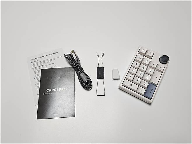 내용물을 모두 꺼내보면 COX CKP01 PRO 넘버패드 본체와 USB A to C 케이블, USB C to A 변환잭, 스위치 및 키캡 풀러, 설명서와 보증서의 알찬 구성으로 이루어져 있습니다.