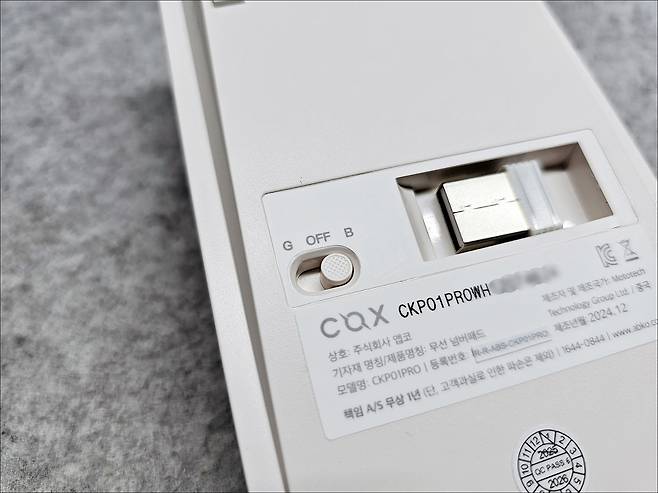 뒤집어 보면 2.4Ghz 무선 연결을 위한 동글과 무선과 블루투스 변환 스위치를 확인할 수 있습니다.
