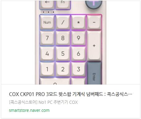 여기까지 COX CKP01 PRO 3모드 기계식 넘버패드를 살펴보았습니다. 이 제품은 숫자 입력이 잦거나 매크로 기능을 활용해야 하지만, 텐키리스 이하의 미니 배열 키보드를 사용 중이거나 키 매핑 및 매크로 기능이 없는 키보드를 사용하고 계신 분들에게 특히 유용한 선택이 될 수 있습니다.