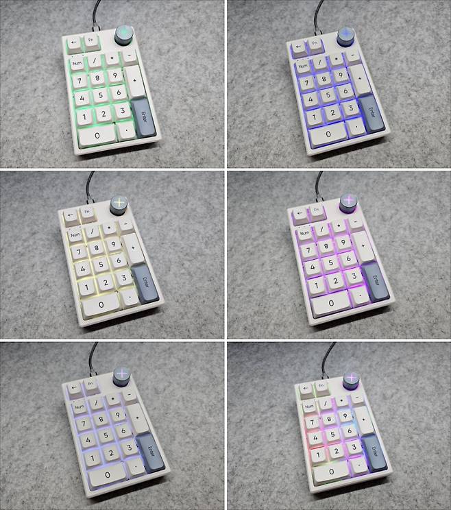 또한 화려한 RGB LED 백라이트를 지원하고 있으며, FN+/, FN+* 스위치를 이용해 LED 모드 변경, 노브 버튼을 길게 눌렀다 뗀 후 노브를 돌려 밝기 조절, 전용 프로그램을 통한 설정 모두 가능합니다.