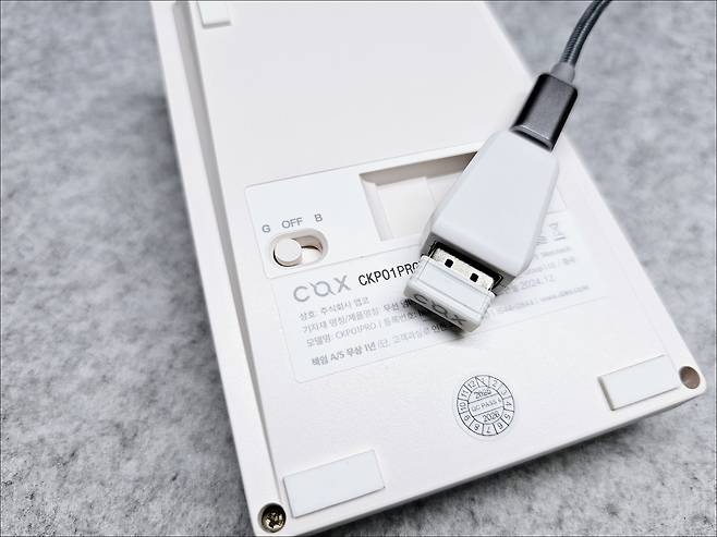 후면 스위치를 G로 옮긴 후 FN+- 키를 누르면 동글을 통한 무선 페어링이 가능하며, 블루투스 기능이 없는 장치에 무선으로 연결해 사용 가능합니다.
