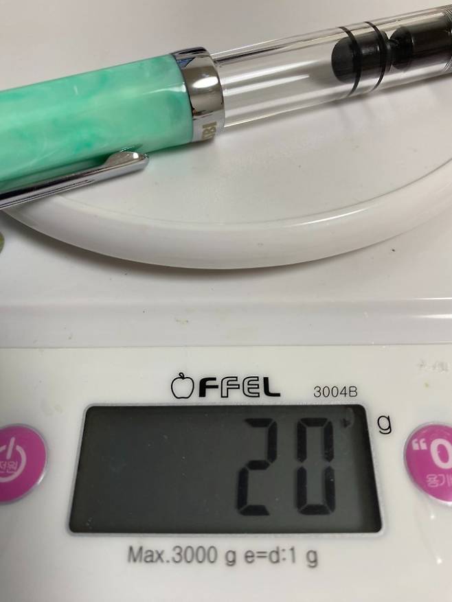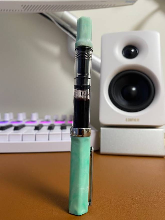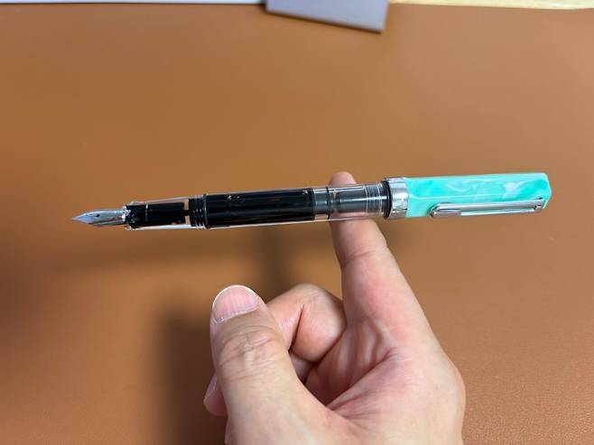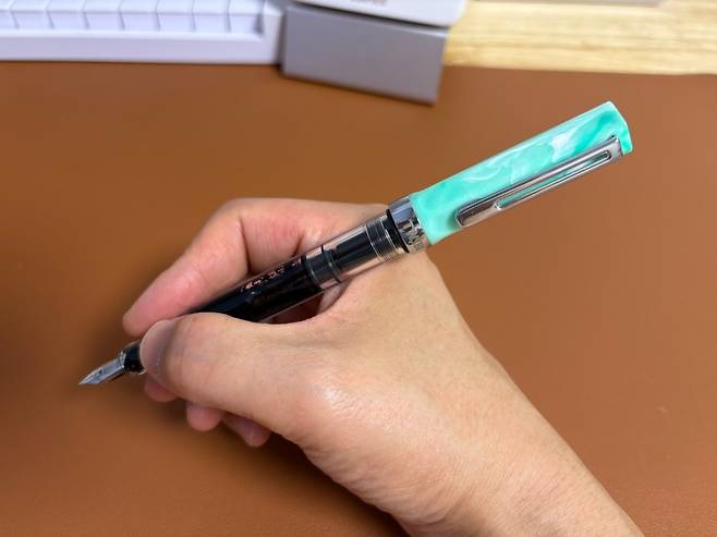 트위스비 에코는 첫 인상이 귀엽다입니다. 바디가 플라스틱으로 이루어져 있고 중간이 투명이어서 젊은 분위기가 납니다. 다만 제 기준에는 고급스럽지는 않으니 격식있는 자리에서 사용하기 보다는 연습이나 필사, 일상 용도에 적합해 보입니다. 두번째 인상은 무척 가볍다는 것입니다. 금속보다는 플라스틱을 주로 사용했기 때문일 텐데요, 잉크를 충전하기 전에는 20그램 정도 되니 오래 사용해도 무리가 없지요. 사이즈도 일반적인 볼펜이나 만년필 정도의 길이입니다. 몸통의 두께도 딱 적당하고 닙쪽으로 갈 수록 얇아져서 그립감도 우수합니다.