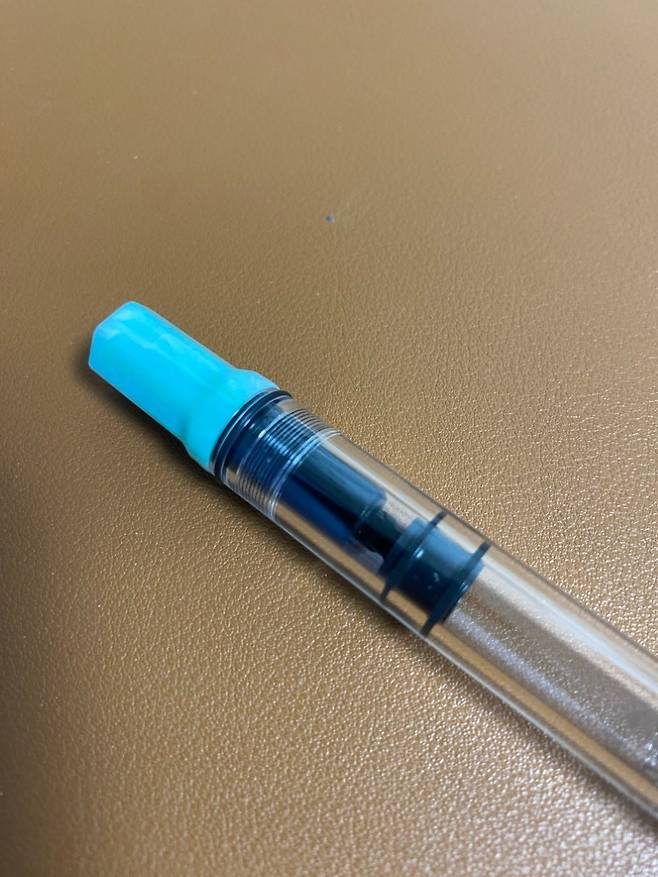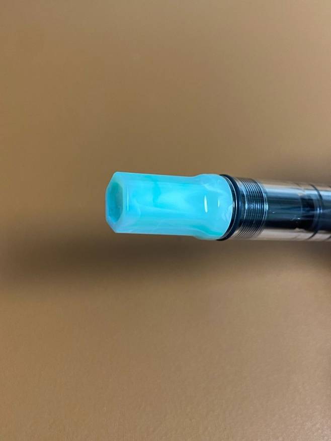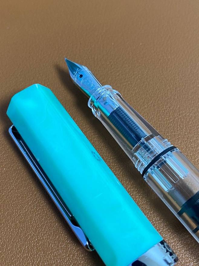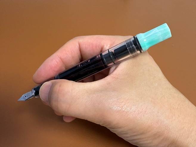 그립감도 좋습니다. 배럴 끝으로 갈 수록 두께가 얇아지기 때문에 손가락으로 잡을 때는 직경이 딱 적당합니다. 라미처럼 각을 두지 않고 원형으로 되어 어떤 분들에게는 불편할 수 있지만 저에게는 장시간 사용해도 그립에 문제는 없었습니다. 무게 중심의 분배도 좋아서 캡을 씌우지 않거나 캡을 씌우거나 어느 한쪽으로 치우지는 무게 중심은 보여주지 않습니다. 물론 투명한 배럴로 인해 잉크의 잔량을 확인할 때도 좋고, 투명한 잉크를 넣어 관상용으로 두어도 멋집니다.