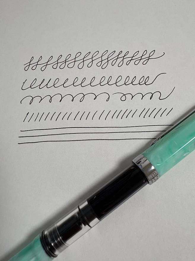필기감은 부드러움보다는 사각거림이 많습니다. 그렇다고 종이를 긁는 수준의 사각거림은 아니며 부드러움과 사각거림 사이를 0과 100으로 둔다면 60 정도로 기분 좋은 사각거림입니다. 잉크의 흐름도 일정하며 속도를 빨리하여 선을 그어도 끊기거나 흐려지지 않습니다. 그리고 펜촉 끝의 팁은 단단한 편이어서 세게 힘을 주기 전에는 비교적 일정한 굵기로 선을 그립니다. 사각거림은 개인 취향이기 때문에 이를 배제한다면 닙의 품질은 수준급인 것 같습니다. 물론 캡이 스크류 방식이어서 장시간 캡을 씌워 두어도 잉크가 마르지 않습니다.