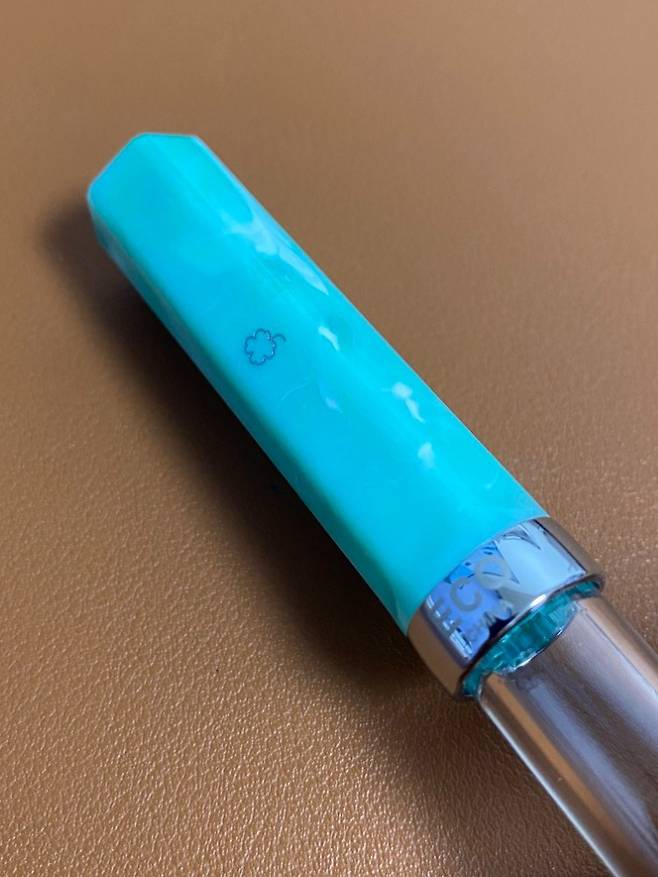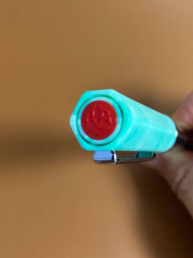 캡의 단면은 육각형으로 강렬한 빨간색의 트위스비 로고가 인쇄되어 있습니다. 트위스비의 로고는 한자로 글월 문을 세 개 겹친 모양인 것은 다들 아시죠? 트위스비라는 제품명의 유래도 그렇듯이 이 제품은 동양의 신비롭고 철학적인 개념을 잘 품고 있는 브랜드 같습니다. 참, 베스트펜에서는 이모티콘 각인 서비스를 해 주고 있습니다. 모든 이모티콘은 아니고 정해진 후보 중에서 고를 수가 있습니다. 저는 아마조나이트 컬러가 행운을 의미하여 네잎 클로바로 새겨 보았습니다. 캡 중앙에 하나의 이모티콘만 있으니 좀 썰렁하네요. 중앙이 아니라 캡 상단부에 인쇄하거나 중앙부라면 여러 이모티콘을 배열하면 더 센스있을 것 같습니다.