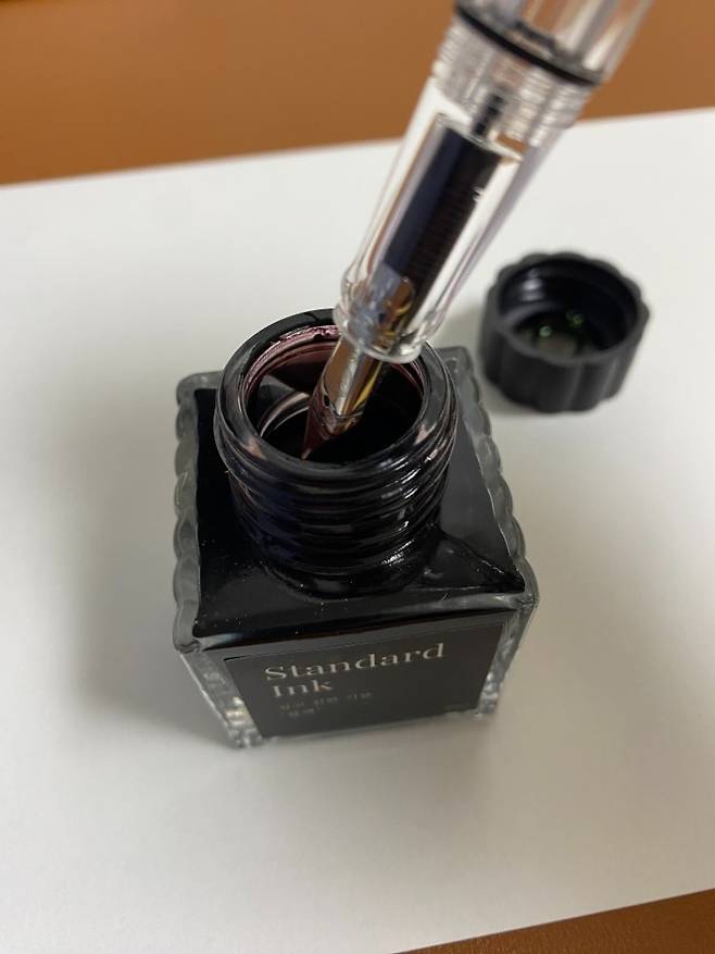 두번째는 피스톤 필러 방식의 잉크 채움입니다. 카트리지로 잉크를 통째로 교체하거나 카트리지처럼 생겼지만 노브를 돌려 잉크를 주입하는 컨버터 방식과 달리 배럴 자체가 잉크 통이 되고 노브 자체를 돌려 잉크를 주입하는 방식입니다. 듣기에는 피스톤 필러도 고급 만년필에 사용되는 방식이라고 하네요. 10만원도 되지 않는 중저가 만년필에서 돌리는 캡이나 피스톤 필러 방식을 지원한다는 것이 놀랍습니다. 피스톤 필러의 장점은 잉크 량을 많이 보관할 수 있다는 것입니다. 배럴 통 자체를 잉크 통으로 사용하니 그럴 수밖에 없죠. 일반적인 컨버터가 1CC 이하인데, 에코의 피스톤 필러는 3CC 정도를 주입할 수 있다니 한번 주입하면 오래 사용할 수 있는 장점이 있습니다. 실제로 선물로 받은 스탠다드 블랙 잉크도 한번 주입하여 몇 주를 사용하는 것 같습니다. 처음에는 실수로 노브를 돌려 잉크가 새지 않을까 걱정을 했습니다. 컨버터는 잉크 노브가 배럴 안에 숨어 있어서 돌릴 걱정이 없지만 피스톤 필러는 노브가 노출되기 때문이죠. 하지만 실제 사용하면서 노브를 돌릴 일이 없어 잉크가 새는 사고는 없었습니다. 잉크를 자주 갈아서 불편한 분들에게는 딱 맞는 제품입니다.