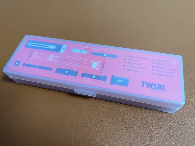 트위스비 에코는 항상 박스를 이야기하죠. 한지를 연상시키는 종이 패키지를 당기면 반투명 플라스틱의 본 케이스가 나타납니다. 케이스 안에는 설명서와 만년필, 드라이버, 윤활제가 들어있습니다. 재미있는 것은 케이스 종이 후면에는 에코의 부품을 상세하게 설명해 놓았다는 것입니다. 설명서 안쪽에도 드라이버로 만년필을 분해하는 그림이 있고요. 그 말은 분해를 해도 된다는 의미죠. 일부 만년필은 분해하는 것을 권장하지 않거나 초보자가 분해를 잘 못하면 제 성능을 발휘 못하는데, 트위스비 에코는 마음대로 분해할 수 있으므로 만년필을 이해하는데 좋은 제품 같습니다.