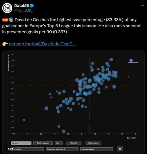 축구 통계 업체 '데이터MB'는 27일(한국시간) "데 헤아는 이번 시즌 유럽 5대리그에서 어떠한 골키퍼보다도 높은 세이브 성공률(83.33%)을 기록하고 있다. 또한 경기당 실점 방어 수치(0.397)에서는 2위를 차지하고 있다"고 전했다.